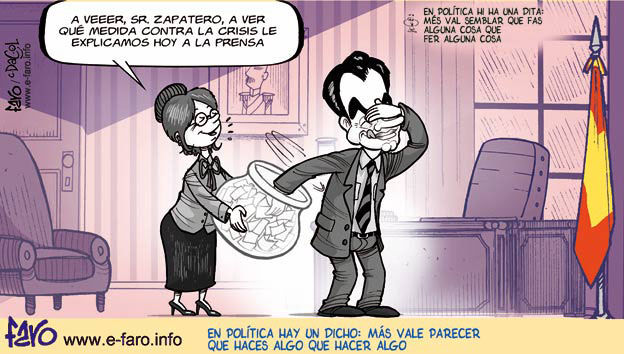 Siguiendo la línea de “La Casa del Arce Rojo” de distender un poco los fines de semana y respirar un poco de aire fresco, vamos a hacer una pequeña andadura por la política ante la crisis del Sr. Zapatero y su corte celestial ¿o era planetaria? apoyándonos en los dibujos de nuestro amigo FARO