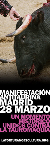 Si quereis aportar vuestro granito de arena y protestar ante semejante abuso, sabed que el día 28 de marzo se ha convocado una gran manifestación en Madrid para protestar por esta declaración de BIC realizada deprisa y corriendo, a la que han seguido la de otros presidentes autonómicos y cuyo único fin es la protección voraz e irracional del mayor y más cruel y sangriento esperpento de este país, la Tortura Nacional.