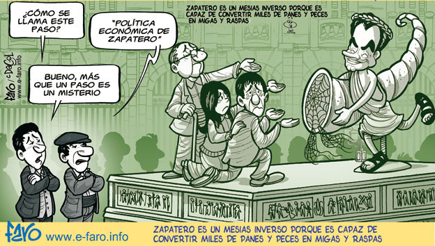 Pero si mal con el PP, casi peor con el PSOE, Zapatero se ha convertido en un Mesías ciego y sordo que nos lleva a toda velocidad al abismo. Más preocupado de sacarse la foto y de aparentar, aunque sea a base de dinero público, está consiguiendo que lo poco que tenemos se esfume, hambre para hoy e inanición para mañana, es el presagio que tenemos ante semejante "Mesías". PP mal, PSOE mal... ¿que nos queda para el pobre ciudadano de a pie? ¿Agua y ajo? o intentar cambiar esto, denunciándolo día a día hasta que cale en la sociedad.