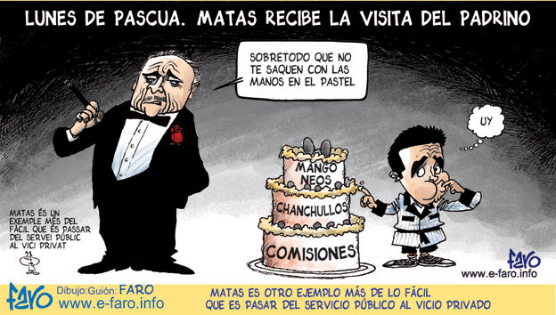 A veces la tentación de la corrupción es muy grande, pero han llegado a un extremo que el descaro e insulto al pueblo español, el verdadero mecenas de estos sinvergüenzas, es total, y me da igual a donde mire uno, a la derecha o a la izquierda el político corrupto no tiene color. Los nuevos datos que se están dando a conocer del caso Gürtel, el tema de Matas, los chanchullos de los sindicatos y un largo etcétera de casos similares hacen que a uno le entren ganas de ajusticiar a todos en plaza pública.