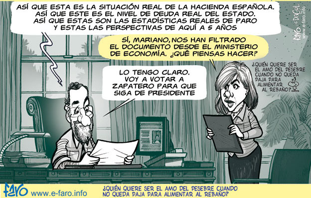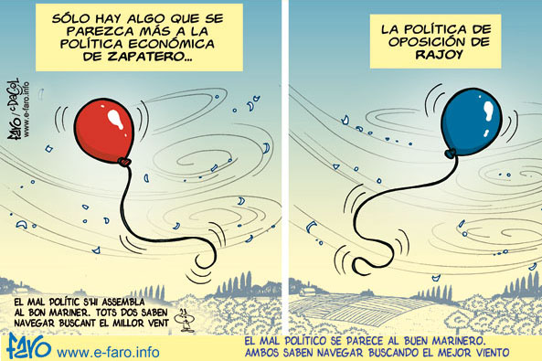 Y mientras esto se va al garete ¿donde está la oposición? mucho hablan de echar a Zapatero pero yo no lo puedo hacer, lo pueden hacer ellos convenciendo a otras fuerzas políticas y presentando una moción de censura. Como no quieren hacerlo porque piensan que en el 2012 Zapatero caerá como fruta madura no hacen absolutamente nada, en la oposición se vive muy bien. Eso si, en el 2012 lejos de estar en recuperación económica es posible que sigamos cayendo ¿Querrá entonces Rajoy hacerse con las riendas de un país arruinado? como dice FARO, a lo mejor hasta él vota a ZP otra vez.