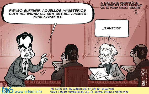 Hoy comenzamos los chistes del domingo con el tema de los recortes. Zapatero se está pensando en recortar ministerios, una medida que lejos de ser una idea de "su talante" está más bien impuesta desde Europa. Esta medida se debería haber tomado cuando las arcas del estado estaban llenas pero no, Zapatero tenía que dilapidar todo nuestro dinero en cheques bebe, 400 euros, ministerios de vivienda e igualdad, planes E y J... ahora los españoles tendremos que devolver este dinero multiplicado por diez. En la empresa privada una gestión económica como la desarrollada por Zapatero sería causa de denuncia y encarcelamiento, como mínimo de despido, sin embargo no solo no va a ser encarcelado sino que va a permanecer 2 años más en la poltrona dilapidando ya no dinero, que no nos queda, sino credibilidad y esperanza porque lejos de ver luz al final del túnel lo que vemos es más y más oscuridad.
