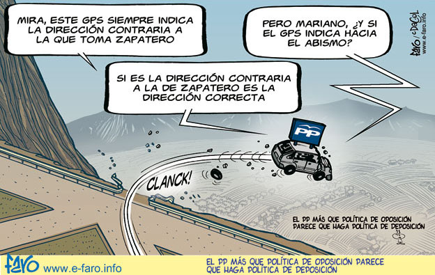 Tan disparatado es hacer caso de lo que dice Zapatero como hacer lo contrario de lo que dice él. Lo que hay que hacer Sr.Rajoy es oposición de verdad, no de cara a la galería. Rajoy, Soraya, Mato, Cospedal, etc. Me han demostrado que son el perro Zapatero, De la Vega, Salgado, Pajín, etc pero con distinto collar.