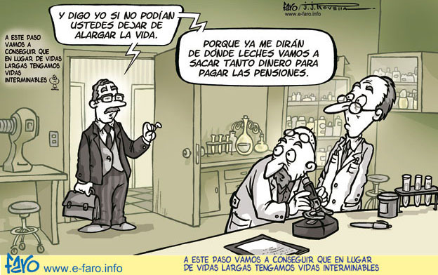 Y para finalizar... ¿que futuro nos espera para los que ahora tienen entre 35 y 50 años? nos suben la edad de jubilación que de seguro acabará llegando a los 70, nos hablan de aumentar la base de cotización a la SS, nos dicen que "a lo mejor" no hay dinero para las pensiones, además de unas empresas con unos departamento de RRHH que se han encabezonado en no querer saber nada de nadie que supere los 40... con este panorama ¿para que queremos vivir más? El gobierno querría aplicar lo que en una novela de ciencia ficción llamada "la fuga de Logan" se aplicaba, una sociedad idílica donde había recursos para todos pero con un pequeño pero... a los 21 años la gente era ejecutada para conseguir esto. ¿ciencia ficción? El PSOE y Camarada Comisario Rubalcaba han logrado hacer real otra novela llamada "1984". No subestimes el poder y la poca vergüenza de nuestros políticos.
