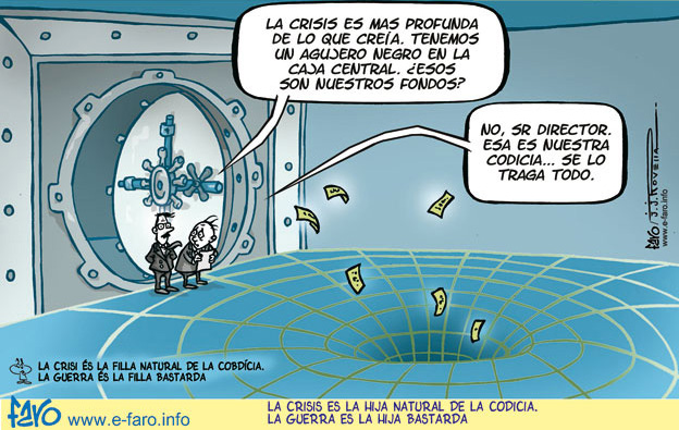 La crisis, los bancos, el capitalismo, el hambre, la desesperación... todos tienen distintos nombres pero el mismo origen: La avaricia humana que no solo se conforma con tener mucho, sino que encima quiere que los demás no tengan. Si mañana estos que nos han metido la crisis en plan "sodoma" pudieran agitar una varita mágica y convertir a todos en ricos de seguro que no lo harían, ya que al riqueza y la pobreza es como la luz y la oscuridad, el bien y el mal, que uno no puede existir sin el otro.