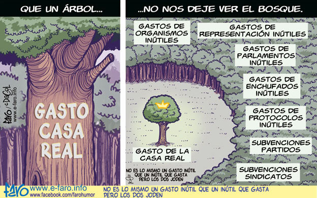 Está claro que el gasto INUTIL de la casa real es solo la puntita del iceberg, pero también está claro que si no empezamos a "talar árboles" NUNCA habrá suficiente dinero ya que el dinero público se ha convertido en ese "abono" que hacen proliferar toda esta panda de aprovechados.
